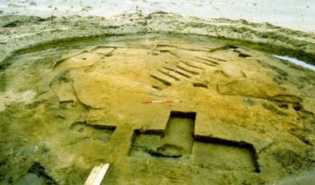 50m south of the henge, a second barrow, with an overall diameter of 17m. had been exposed close to the line of the old sea bank, washed away in the 1960’s. A ditch with an external bank enclosed a circular area of gravel 9m across with the bones of a crouched adult inhumation at its centre. The skeleton, lying on its right side with its head to the south-west, may have been buried in a very shallow grave or simply laid on the land surface beneath a mound. Shards of a Bronze Age collared urn were recovered from the same surface. Like the later phase of the henge, the ditch and bank of this barrow had been upstanding at the time of the estuarine incursion. External banks have not been recognized before in East Yorkshire barrows, but ploughing is likely to have destroyed much of the evidence elsewhere.