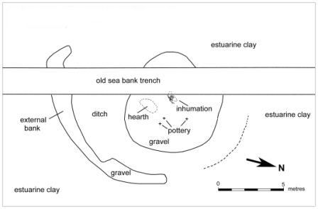 The black soil was covered in places by a blanket of gravel, possibly a new surface created when the much larger outer ditch was dug, enclosing an area of about 20m. This second phase had a substantial outer bank with a possible entrance on the NNW. Unfortunately, the opposite side of the monument had been destroyed by marine inundation. This event had also filled the outer ditch with estuarine clay, at a time when the monument was still upstanding and perhaps not long after its construction, because there was little earlier terrestrial silting. A single sherd of Iron Age pottery, recovered from the surface of the ditch fill, supports a first millennium BC date for the inundation. All the evidence so far, indicates that the first phase of this monument would have been in use when the Easington barrow was built.